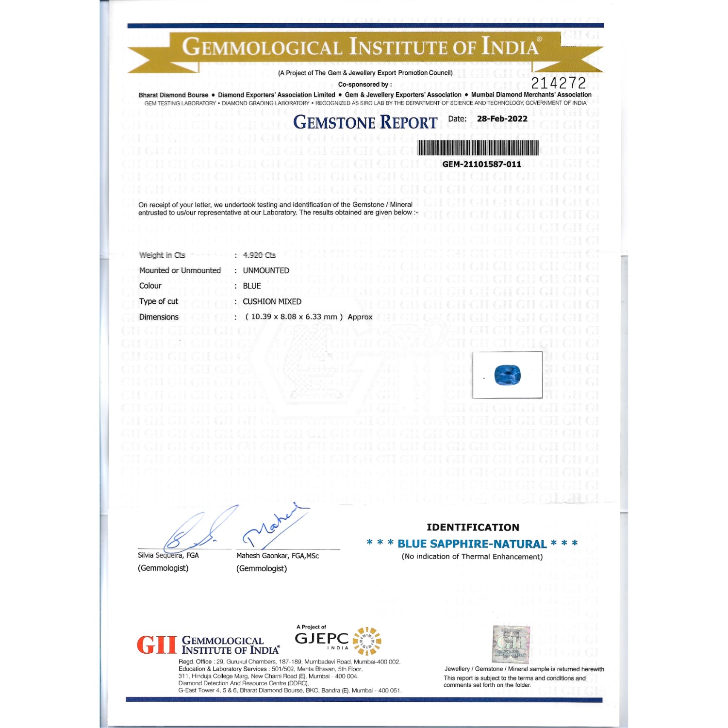 Gemmological Institute of India (GII) Certified -